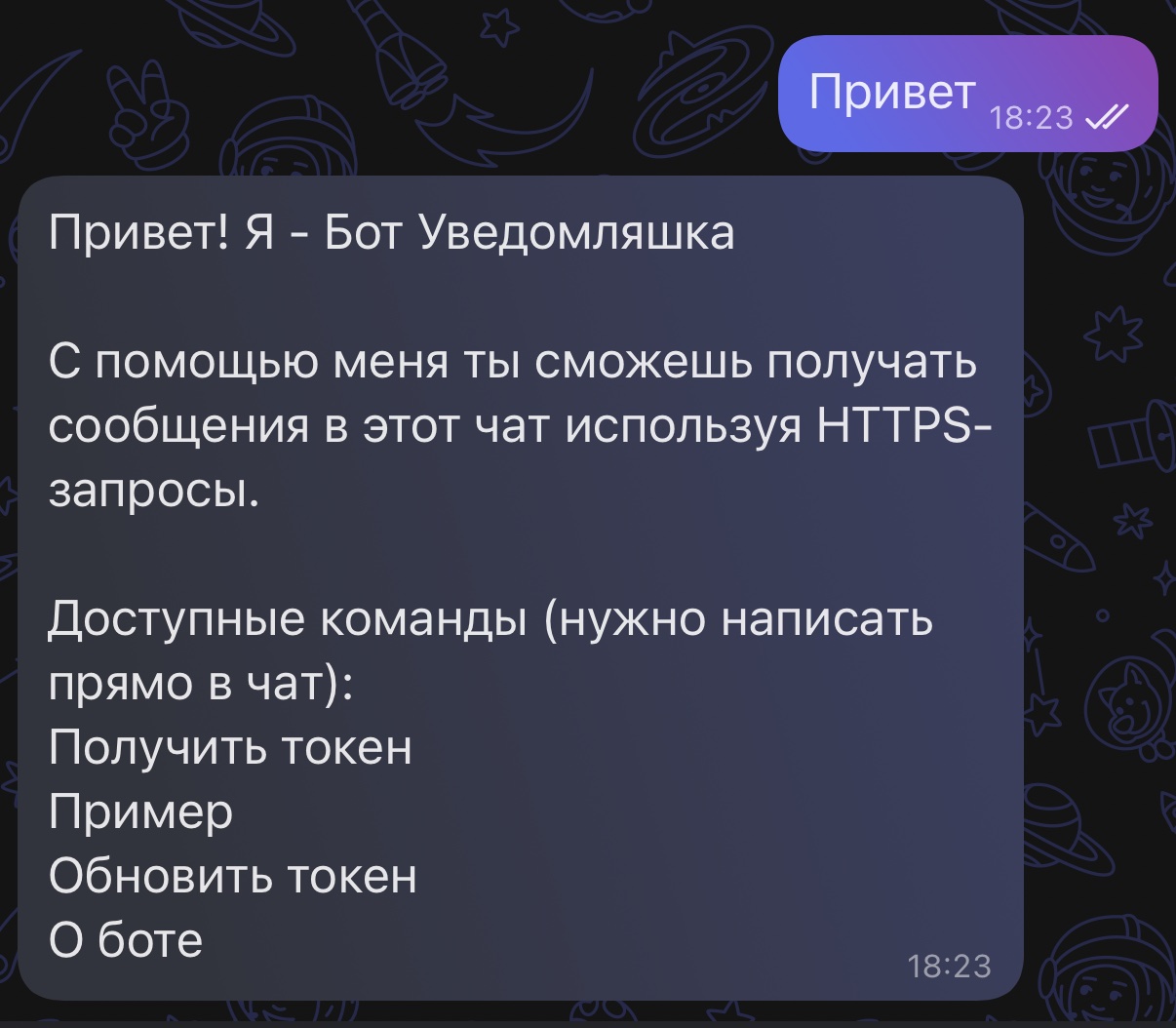 4. Готово! Отправь любое сообщение любым удобным способом и бот перешлёт его тебе! Пример: