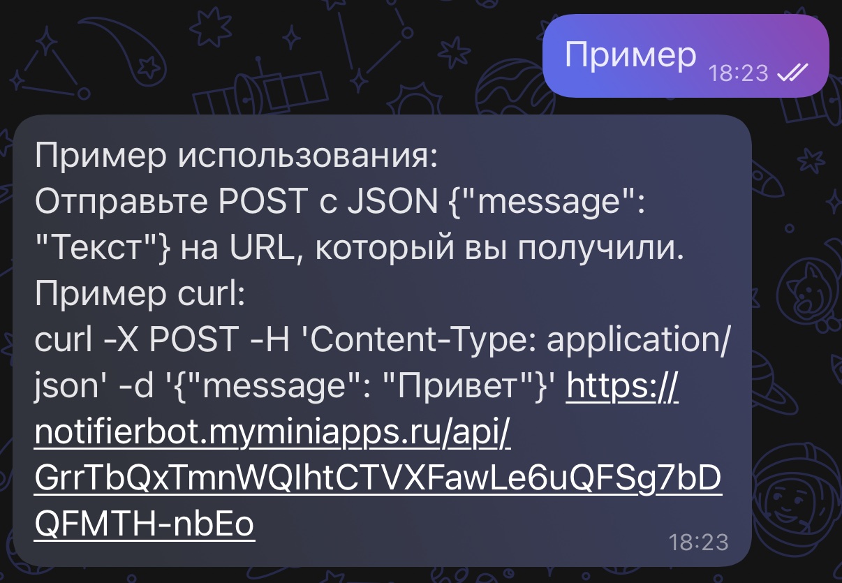 curl -X POST -H 'Content-Type: application/json' -d '{"message": "Привет"}' https://notifierbot.myminiapps.ru/api/GrrTbQxTmnWQIhtCTVXFawLe6uQFSg7bDQFMTH-nbEo