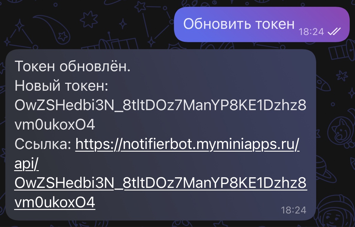 Токен это секрет. Не публикуй его в открытых репозиториях. Если токен скомпрометирован, используй команду "Обновить токен" в чате, чтобы сгенерировать новый.